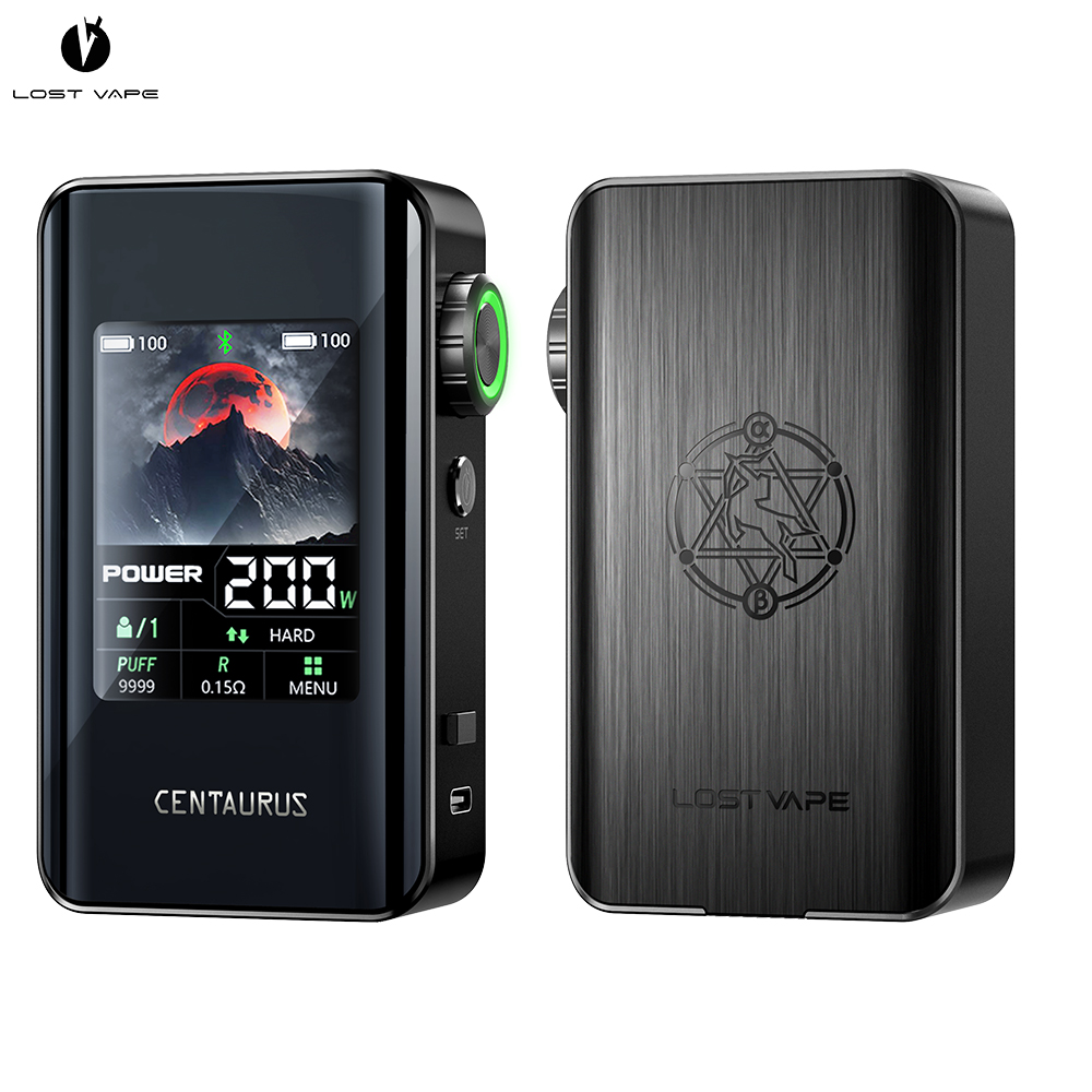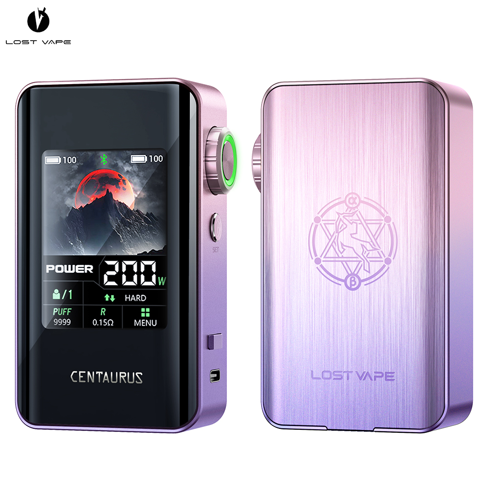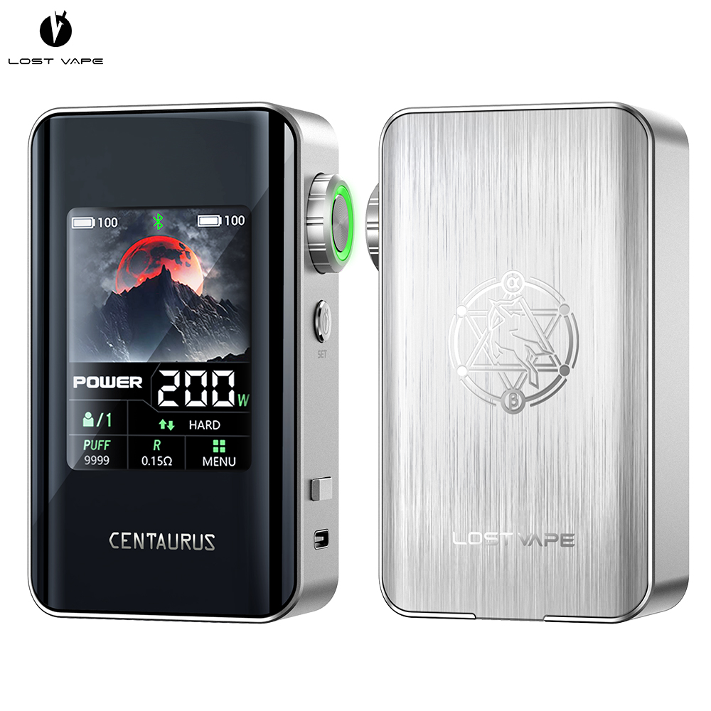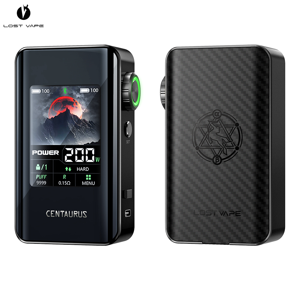 Vous voulez une box imposante, puissante et moderne ? LostVape envoie du lourd avec un mod double accus qui sera parfait pour les gros nuages ! La box Centaurus BT200 Lost Vape sera idéale pour les amateurs de beau matos de vape. Massive, moderne et endurante, cette box côtoie le sublime. La box Centaurus BT200 pourra vous donner 200W de puissance max grâce à 2 accus 18650 (non fournis). Ce qui marque au premier regard, c’est son énorme écran de 2.4 pouces ! On retrouve avec joie l’ADN de la gamme Centaurus avec une molette de réglage et un bouton A-Lock fort pratique lors des déplacements. Plusieurs modes d’utilisation sont disponibles (Power, Turbo, SS316, Ti, Ni, Voltage et VPC) pour une vape d’experts. Elle a même une fonction Bluetooth. Bienvenue dans le futur de l’e-cigarette grâce à Lost Vape ! La box Centaurus BT200 LostVape est disponible à l’achat avec de nombreux coloris. Allez-vous réussir à choisir ? Contenu du coffret : 1 box Centaurus BT200 1 câble USB-C 1 manuel d’utilisation