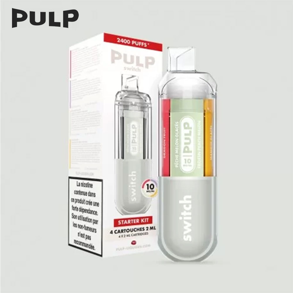 Le Pod switch by PULP permet de basculer entre 4 saveurs grâce à ses cartouches interchangeables. Il offre une vape dense, une autonomie de 2400 puffs et une sensation douce grâce aux sels de nicotine. Starter Kit Gris : Fruit du Dragon, Raisin Noir, Pêche Melon Glacés, Mangue Glacée