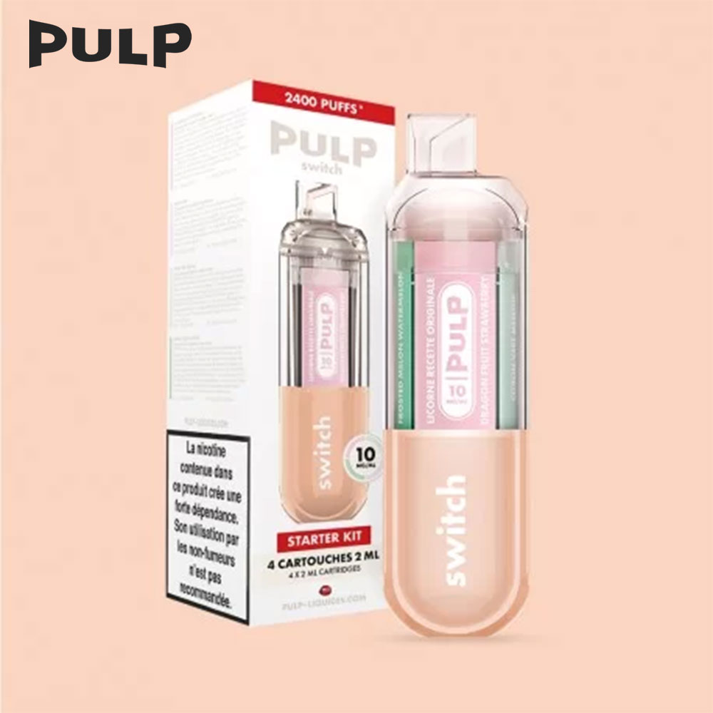 Le Pod switch by PULP permet de basculer entre 4 saveurs grâce à ses cartouches interchangeables. Il offre une vape dense, une autonomie de 2400 puffs et une sensation douce grâce aux sels de nicotine. Starter Kit Rose : Licorne Recette Originale, Citron Vert Menthe, Cassis Givré, Pastèque Melon Givrés
