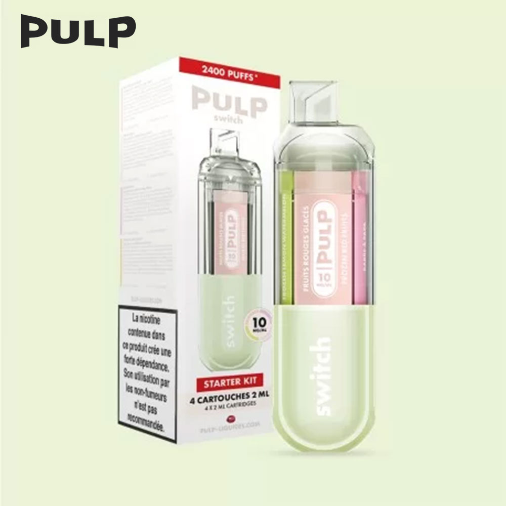 Le Pod switch by PULP permet de basculer entre 4 saveurs grâce à ses cartouches interchangeables. Il offre une vape dense, une autonomie de 2400 puffs et une sensation douce grâce aux sels de nicotine. Starter Kit Vert : Fruits Rouges Glacés, Barbe à Papa, Cerise Glacée, Pastèque Citron Glacés